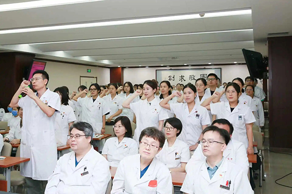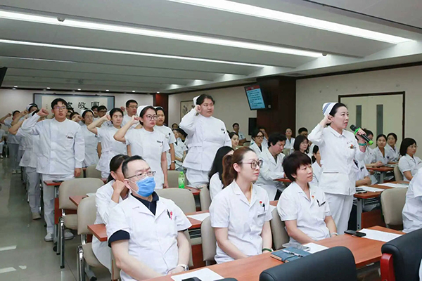 医务处副处长邵魁卿、护理部主任李静带领新职工面对院旗庄严宣誓,郑重承诺志愿献身人类的健康事业,自觉维护医学的尊严和神圣,践行医院服务理念,为中医药事业传承创新发展接续奋斗。