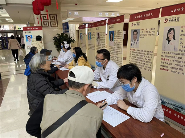 11月11日下午及14日下午,内分泌科医护团队在医院门诊楼一层大厅连续举办两场“中医药助力糖尿病与幸福感”公益活动,这也是医院“西苑大爱、健康守护”百场义诊系列活动的重要组成部分。义诊现场医疗专家为咨询的群众解读检查报告,针对糖尿病及并发症提供个性化诊疗建议与用药指导。护理团队为到场的市民提供免费血糖检测服务,并围绕饮食搭配、运动指导、糖尿病足护理、皮肤护理、血糖监测技巧等耐心解答市民疑问。