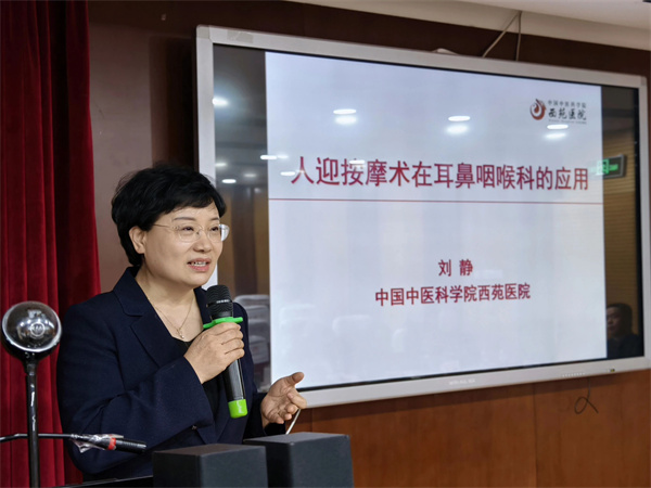 在学术交流阶段,东方医院主任医师王嘉玺,东直门医院副院长、主任医师闫占峰,北京友谊医院主任医师李革临,望京医院主任医师冯炜,眼科医院主任医师刘勇刚,广安门医院主任医师张予,清华大学第一附属医院副主任医师高云海,北京市大兴区人民医院副主任医师李海洋分别讲解了“柔行功法在眩晕治疗中的应用”“耳鼻喉科常用割烙治法的基础与临床”“嗓音矫治方法探讨”“针刺鼻中穴在鼻病中的应用体会”“嗅觉训练的芳香中药外治拓展”“八段锦在耳鼻咽喉疾病治疗中的应用”“穴位注射治疗耳鸣耳聋的临床应用”“鼻腔冲洗在鼻科疾病诊疗中的应用”。西苑医院耳鼻喉科主任、主任医师刘静讲解了“人迎按摩术治疗耳鼻咽喉疾病的临床应用”。刘静表示医学对人、对疾病的认知是远远不够的,需要努力提升每一位耳鼻喉从业医生的综合能力,才能让更多的患者受益于中西医结合诊疗。西苑医院主任医师李蕾、东方医院主任医师刘雪冰、北京友谊医院平谷医院副主任医师吴斌和望京医院副主任医师辛忠海主持了本次会议。